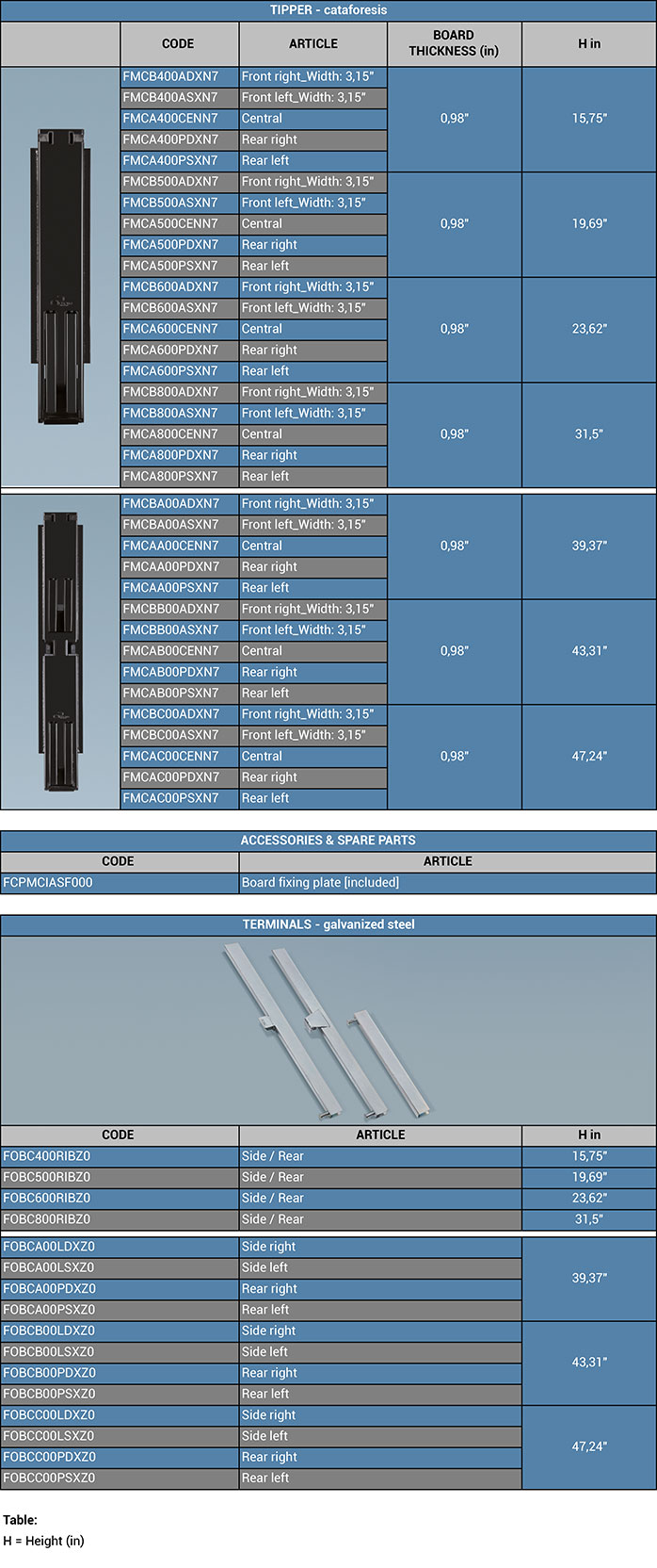 Tipper pillar: double opening of the board, from top downwards or only downwards keeping closed the upper part, it can be completely removed. Solid and easy handling, it is mainly used on vehicles carrying gravel, grain or other loose stuff. Cataforesis painted.