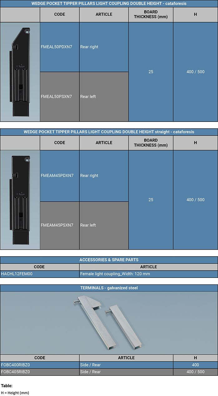 Wedge pocket tipper pillar light coupling double height: double opening of the board, from top downwards or only downwards keeping closed the upper part. It can be completely removed, the upper rear closure facilitates the opening of the rear side during the unloading operations. The straight version above can be extended in height by means of the top pillar or in alternative the poles holder support can be installed. Suitable for light vehicles used for transporting grain, gravel, or any loose material.