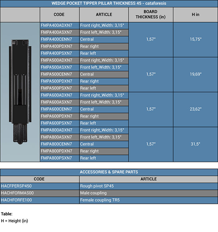 Wedge pocket pillar for tipper: double opening of the board, from top downwards or only downwards keeping closed the upper part. It can be completely removed. Suitable for trucks carrying gravel, grain or any loose stuff. Cataforesis painted.