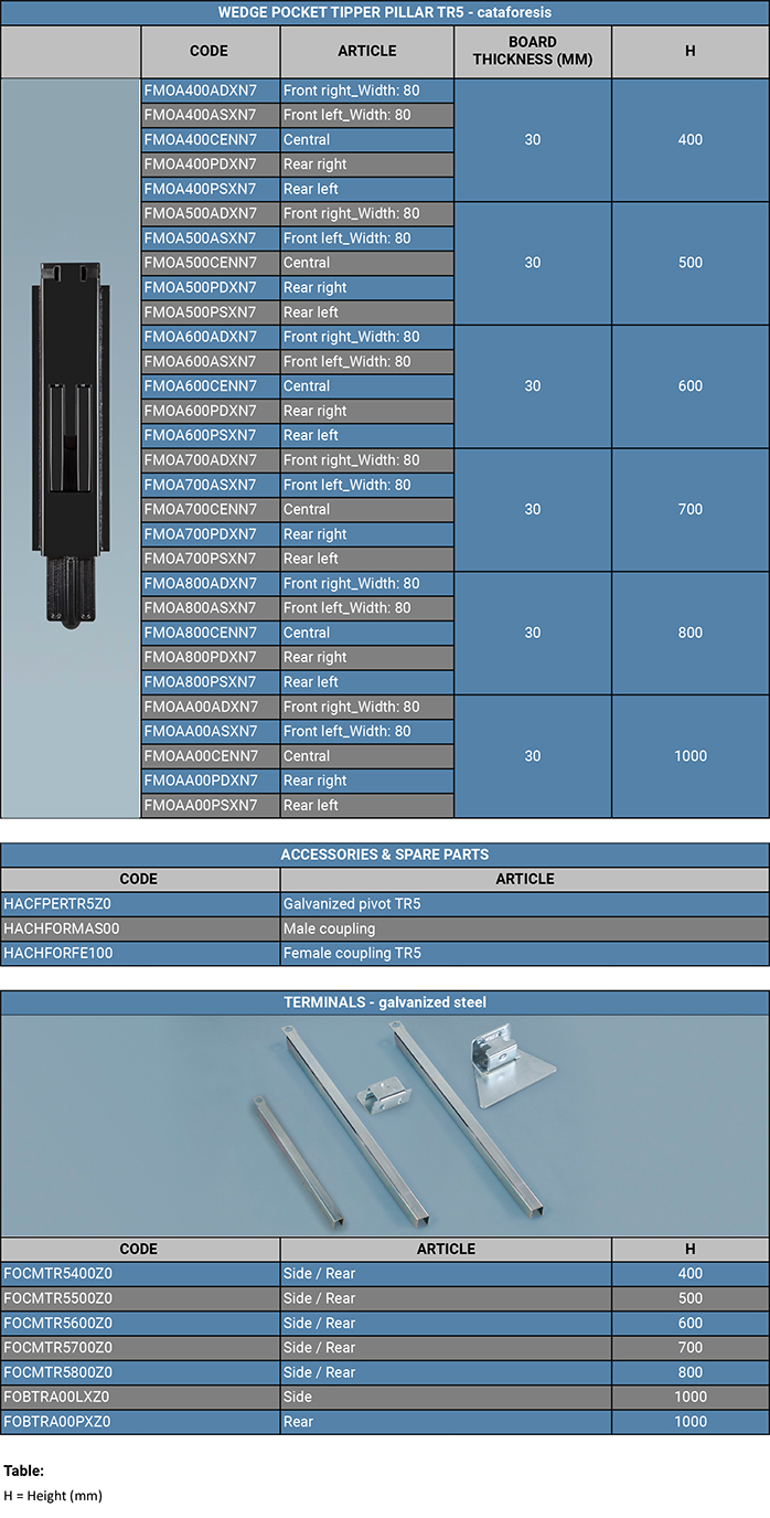 Wedge pocket pillar for tipper: double opening of the board, from top downwards or only downwards keeping closed the upper part. It can be completely removed. Suitable for trucks carrying gravel, grain or any loose stuff. Cataforesis painted.