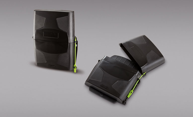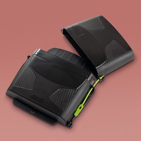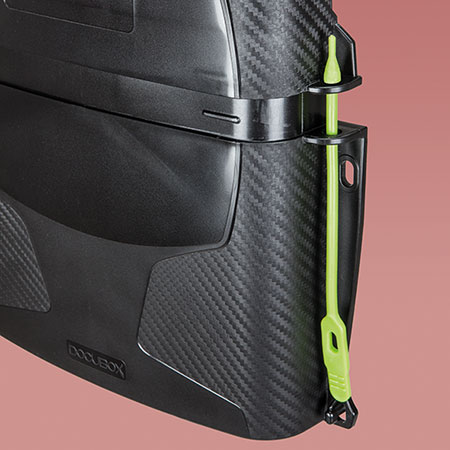 The strap molded in green fluorescent elastomer ensures that the document holder for trailer is closed and prevents accidental loss of the cover; the Docubox content can be secured with a padlock (not supplied) thanks to the practical holes in the lid.