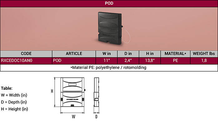 POD is a document holder for trucks produced by Co.Par. srl, rotomolded in first choice polyethylene totally recyclable. POD is particularly quick to install thanks to the fixing holes made directly on its same body. The generous dimensions of the cover ensure easy insertion and extraction of the documents, moreover the A4 format allows you to keep them in perfect condition without annoying creases.