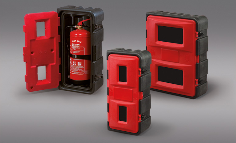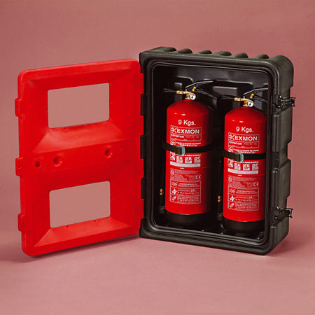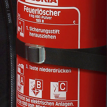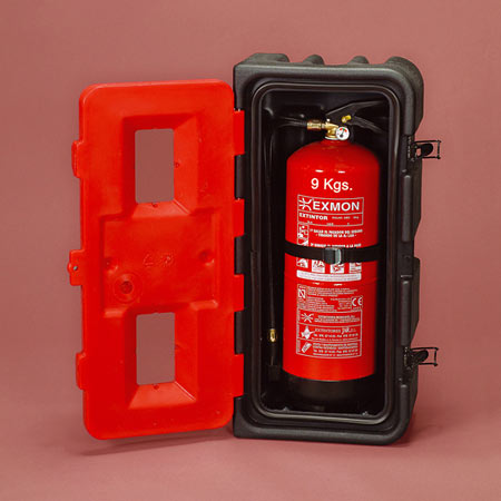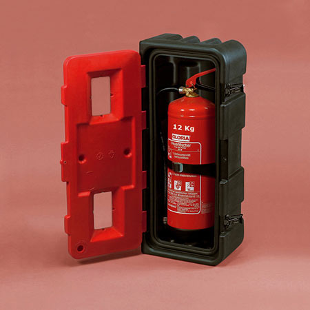 The compact structure with double wall assures great performances in case of impact. The front plexiglas windows, moulded-in with the lid, and the gasket hermetically seal the holder body and make it completely water-proof. It is standardly supplied with extinguisher fastening strap.