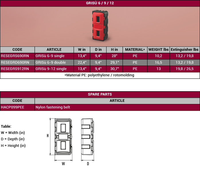 GRISU' 6-9-12 is the line of roto-moulded fireboxes. Available in three models: GRISU' 6-9 single and double, both capable to store 13 or 20 lbs extinguishers; GRISU' 9-12 single for 20 or 27 lbs extinguishers.