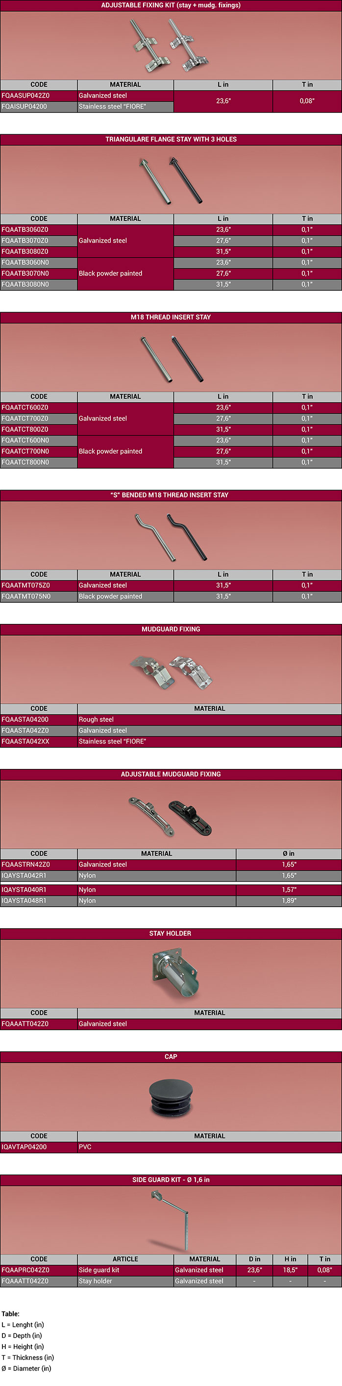 The mudguard support kit with diameter 1,65” is complete of galvanized stay (L: 23,6”) and mudguard fixings in galvanized steel or stainless steel FIORE, fixed or adjustable. The mudguard fixings can be supplied also in NYLON for adjustable (slides) fitment.