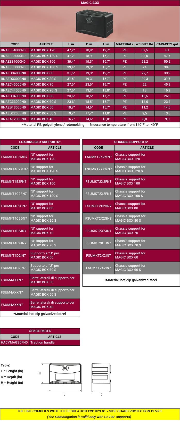 MAGIC BOX is the line of plastic toolboxes of Company CO.PAR. moulded in polyethylene with rotomolding system. They display a fascinating design besides being extremely user-friendly, tough and anti-shock (50 J). The installation of the toolbox is easy and rapid thanks to the universal “U” supports, cataforesis painted.