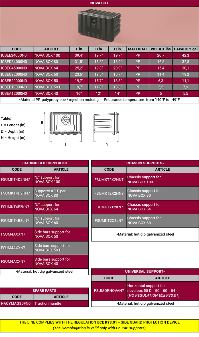 Plastic truck toolbox of new conception, injection moulded in 1st quality polypropylene (PP) – fully recyclable and resistant to most chemicals. Sturdy and extremely long lasting in any weather condition, NOVA BOX guarantees highest impact strenght. Light weight and smart line. One of the major PLUS of the line is the packaging: indeed the plastic toolbox is stackable, a clever system which optimizes at most the volume and therefore enables greatest saving on the freight.