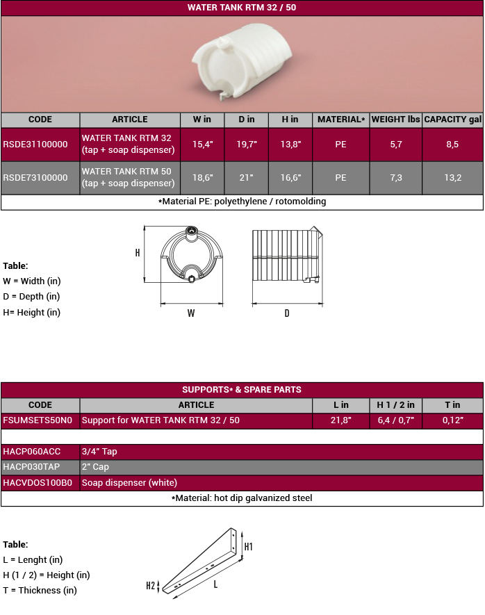 Plastic water tank RTM are standardly equipped with cap and tap; the soap-dispenser is available as accessory. For their fixing CO.PAR. recommends to use the serial galvanized supports.